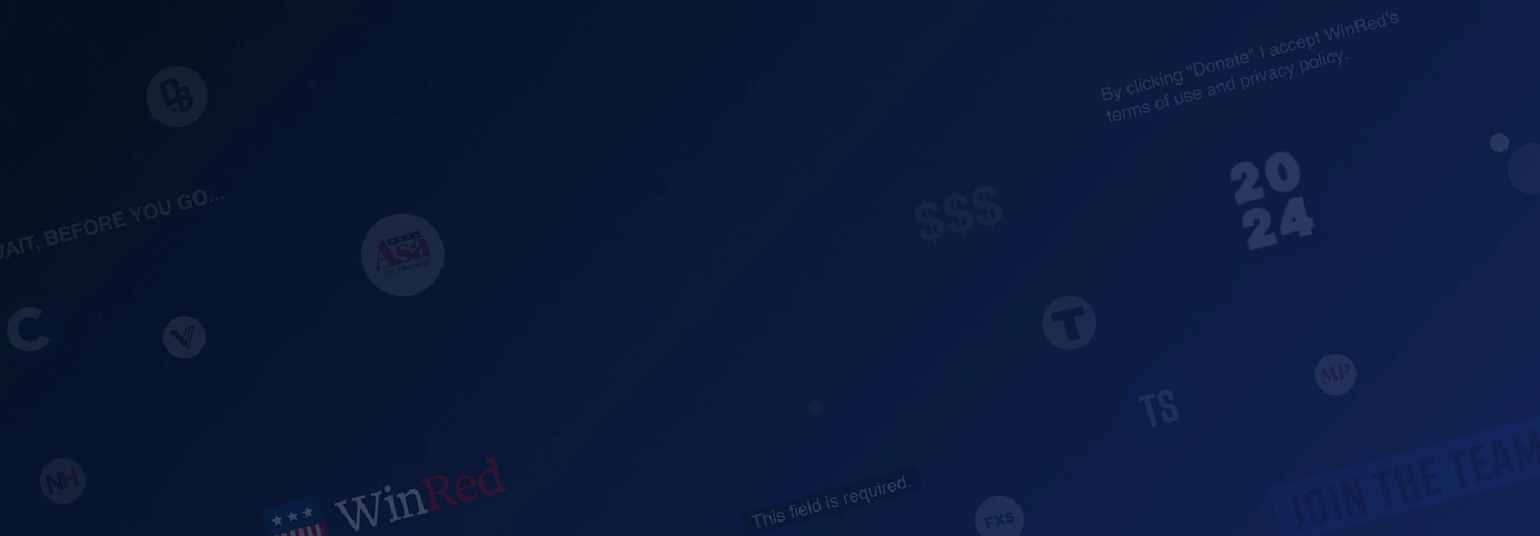 Thankfully, this horrible background is replaced on mobile views. On smaller screens, the header image integrates the logo with an appropriate candidate image, creating a design that isn’t overwhelming and allows the content to breathe. While Asa’s floating torso (and proceeding copy) would benefit from some refinement, the logo + candidate image approach is precisely what more WinRed mobile views should be doing.